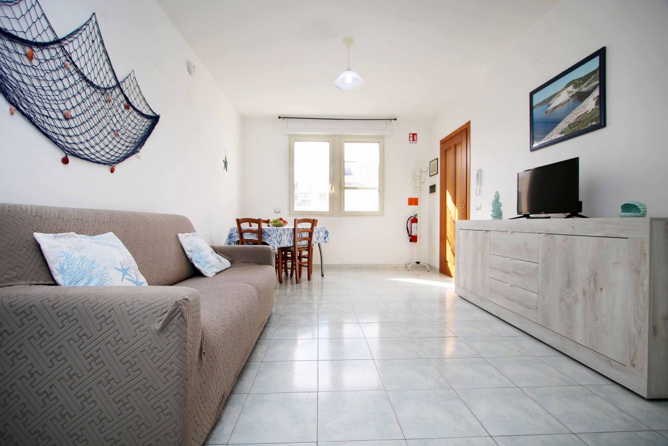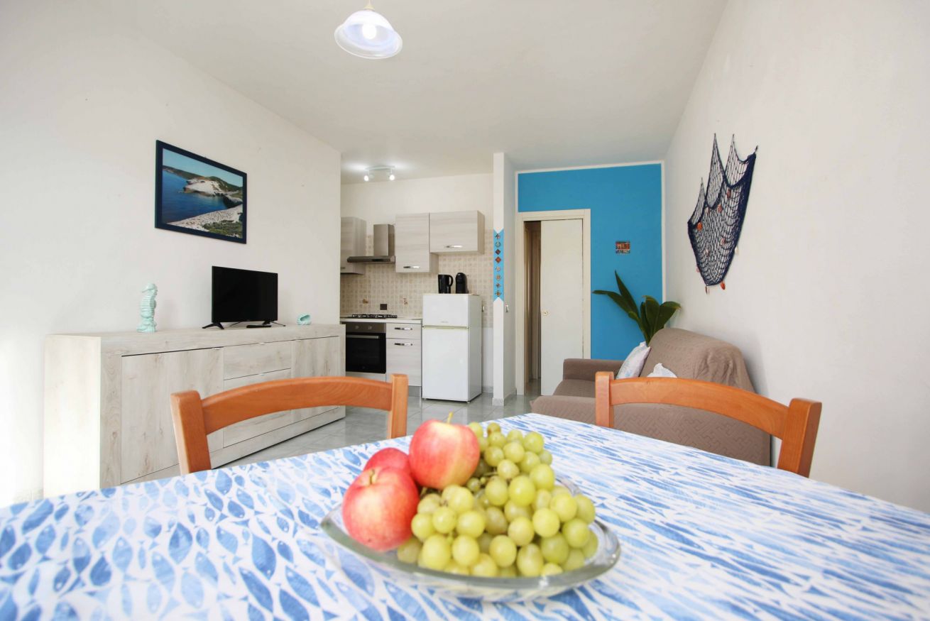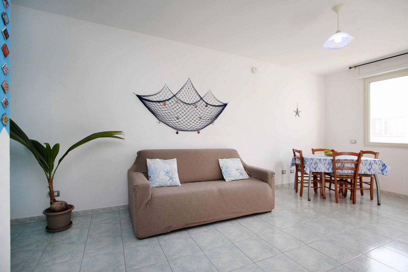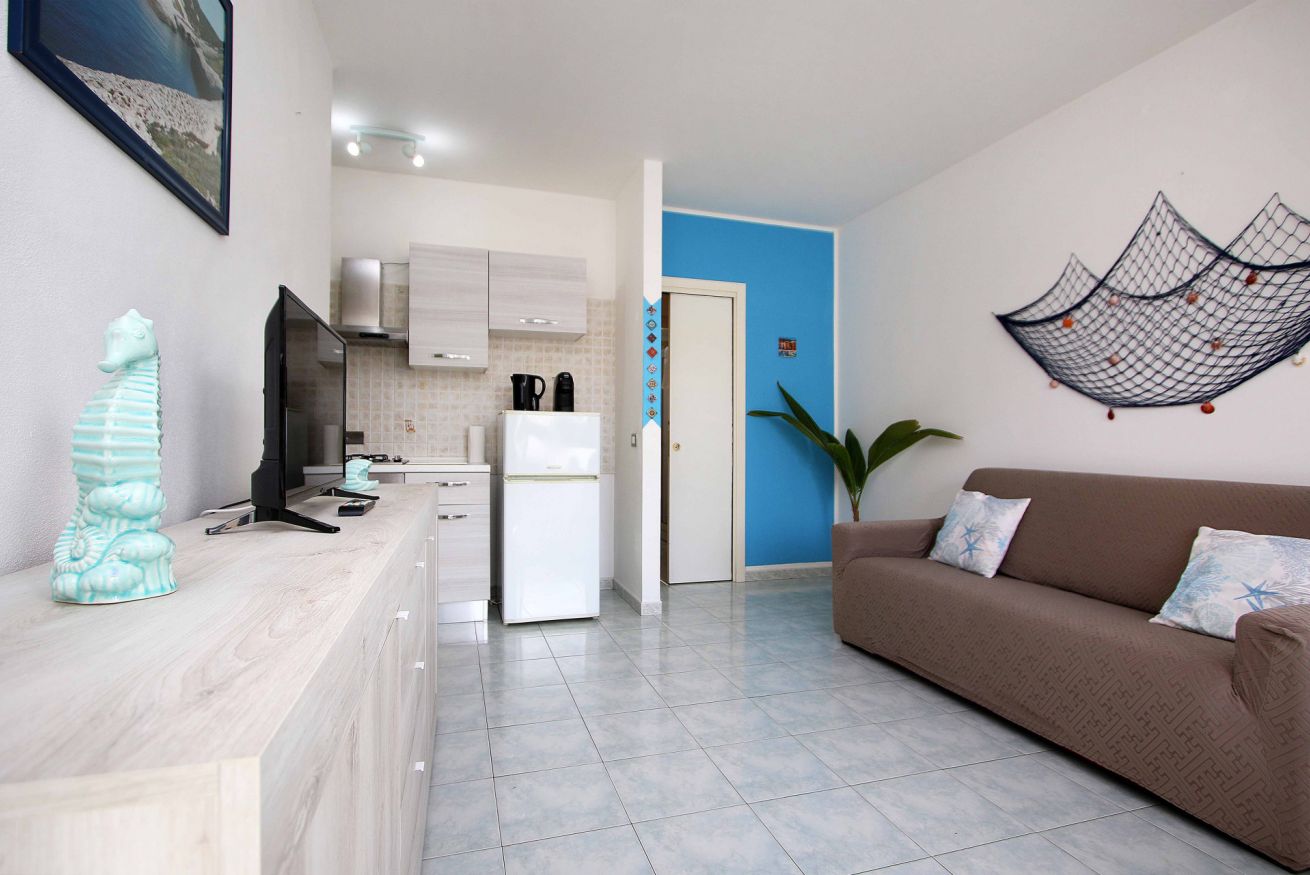 L’appartamento si trova al primo piano di una palazzina tranquilla e ben tenuta. L’ingresso conduce a un luminoso soggiorno con cucina open space, arredato con tonalità chiare e dettagli ispirati al mare. Qui troverete un ambiente caldo e funzionale, perfetto per rilassarsi al rientro dalla spiaggia o trascorrere piacevoli momenti in famiglia.