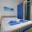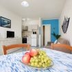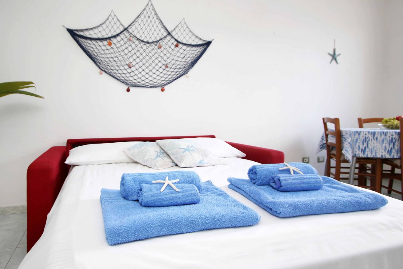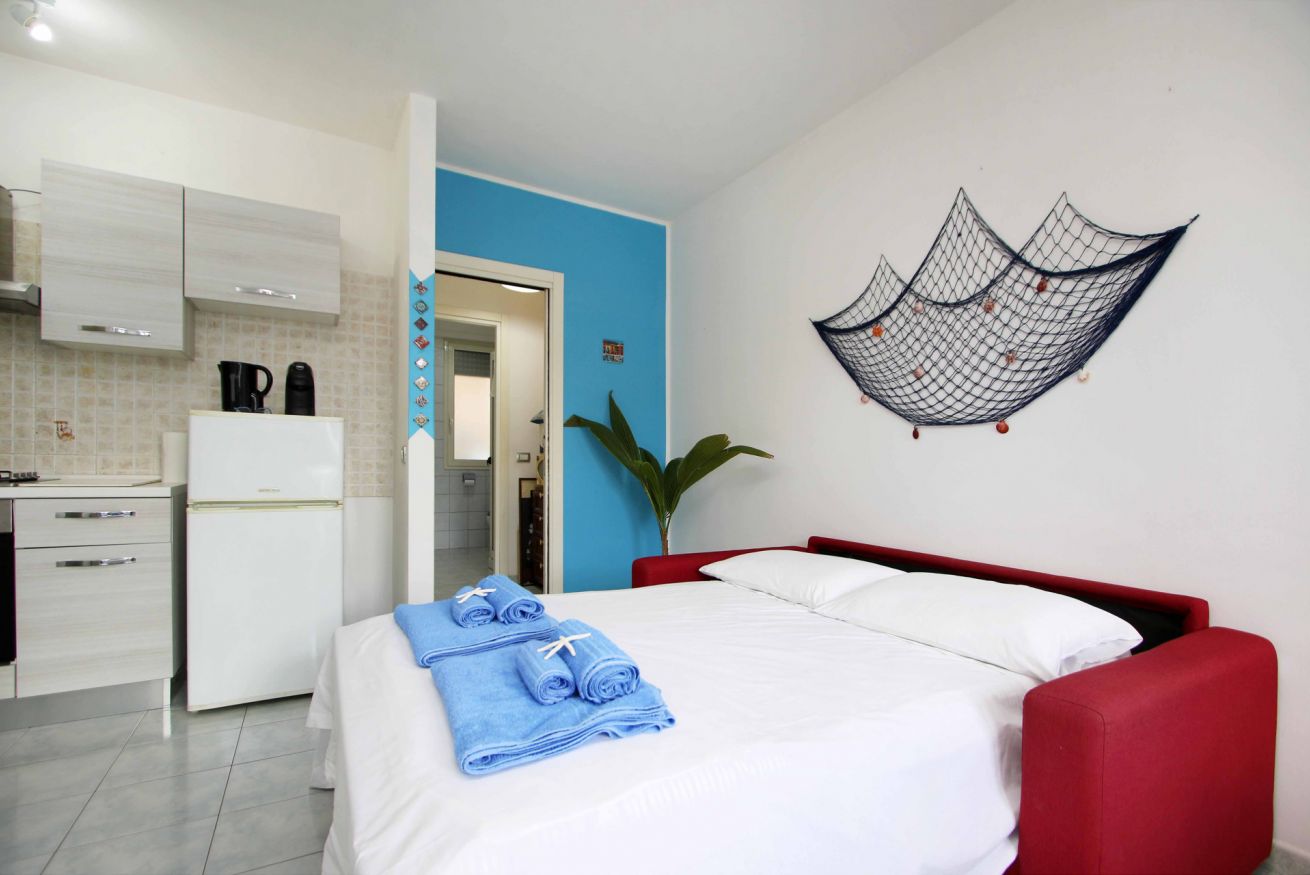Il soggiorno dispone anche di un comodo divano letto con materasso, ideale per ospitare due bambini o ragazzi. È presente una TV e il Wi-Fi veloce, perfetto per chi vuole rimanere connesso, lavorare da remoto o organizzare le attività giornaliere.